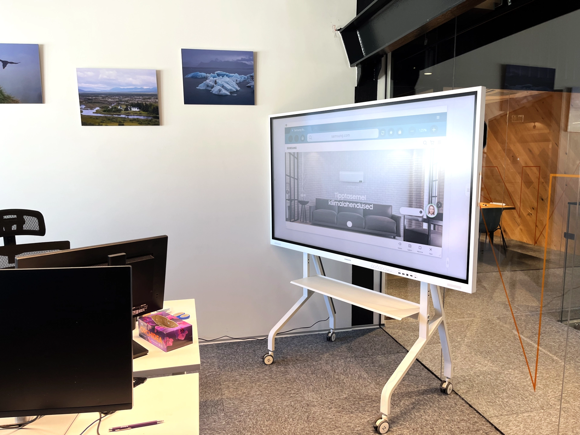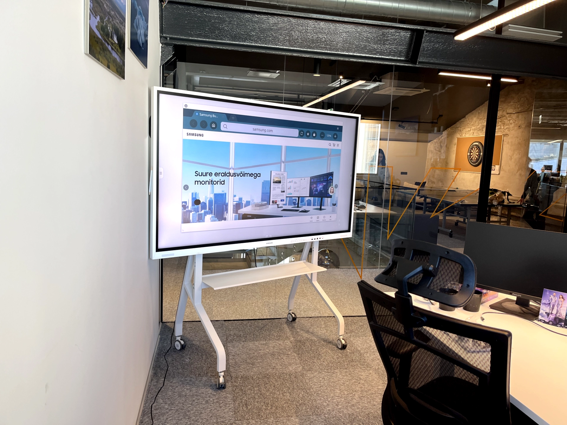 Samsung Flipi minimalistlik disain sobib hästi kaasaegsesse kontorisse. Valge raam ja ratastel alus võimaldavad seadet: